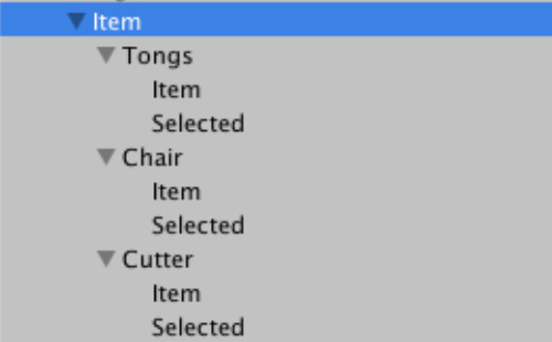 TongsやChair、Cutterが白い長方形オブジェクトでItemがアイテムの画像オブジェクト、Selectedが選択状態用の赤枠の画像オブジェクトです。TongsたちとItem、Selectedは親子関係にあり、SelectItem関数は親のクリックイベントにセットされています。ItemとSelectedには何のイベントもついていません。つまり今言った例外パターンの条件を満たしているので、ItemやSelectedの上にカーソルがある時でもSelectItemを発動させることができます。
