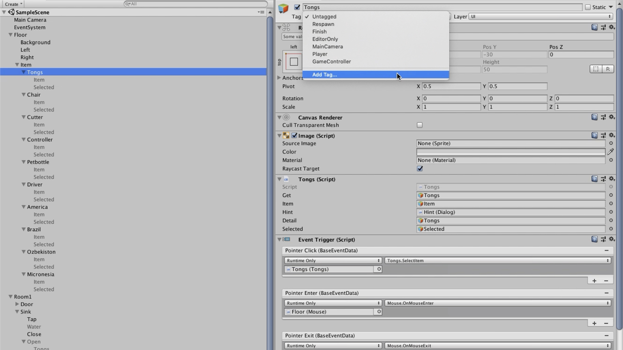 これはオブジェクトをタグ付けするための設定項目です。デフォルトでもいくつかのタグが用意されているんですが「Add Tag」で好きな名前のタグを作成できるので、これで共通のタグをつければ複数のオブジェクトをグループ化でき、配列用の変数に一つずつオブジェクトをセットしなくてもforeachでまとめて扱えるようになります。