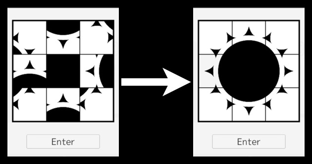 これは僕が前に作った別の脱出ゲーム(シルエットルームからの脱出2)で出したやつなんですけど、太陽の画像を3×3のボタンに分解して、9個のボタンをそれぞれくるくる回してそろえてもらうというパスワードです。本当は回すのは8個なんですけどその理由は後で説明します。