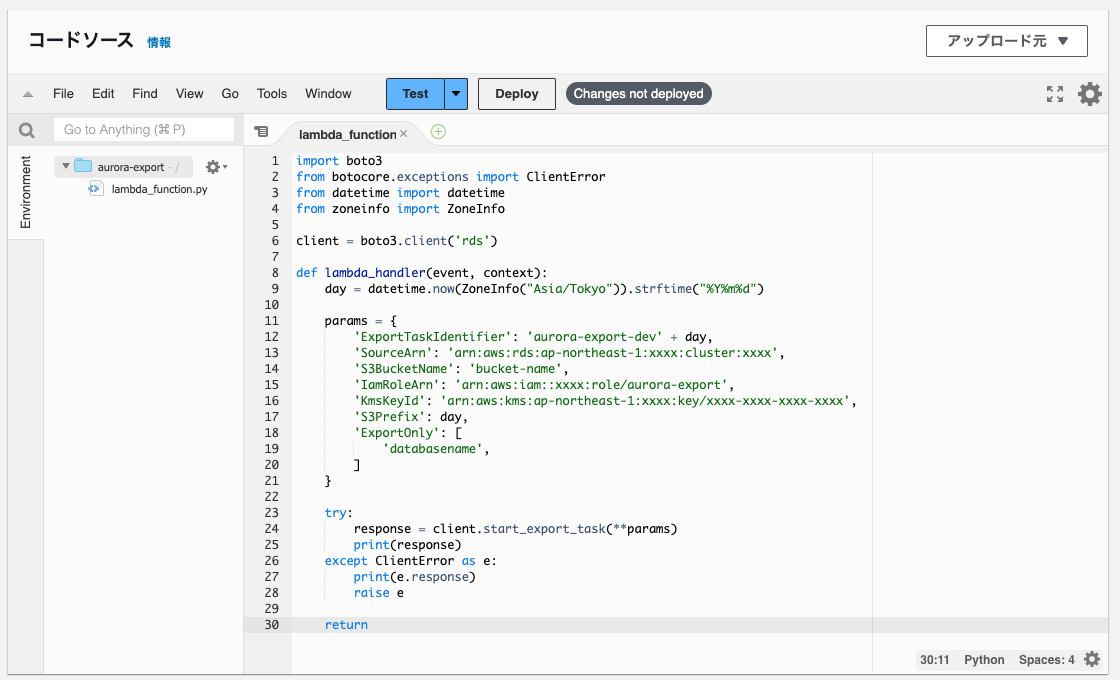 ExportTaskIdentifier・・・RDSのコンソール画面でエクスポートを行う時のエクスポート識別子に相当するものです。これは一意でなければいけないので、上記の場合は日時で定期実行するようなケースを想定して、datetime関数を使って名前に年月日をくっつけています。