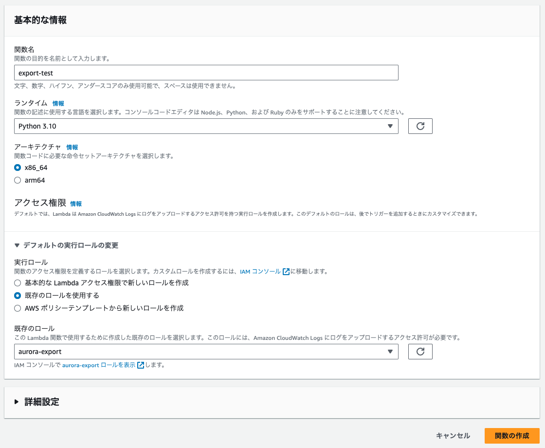ちなみに関数作成時に新しいロールを自動で作成する場合、信頼されたエンティティの方は自動で作成されますが、上記の許可ポリシーは自動で作成されないのでどのみち自分で追加しなくてはいけません。この許可ポリシーはエクスポートを実行するのに必要なポリシーです。