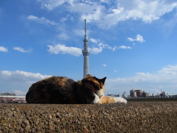 河川敷を歩いていたらスカイツリーをじ~っと眺めているねこにゃんに出会いました。